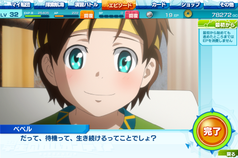 しかし、前回のクローズドβテストと比べると研究がない、ガチャでレアカードがでない、スキルが減らされている、という事で要素が減っているので、退化している印象ですね。前回はエピソードを見るのにAP(ブラウザゲームでありがちな行動を行うのに必要な数値)を消費していましたが、不評だったみたいで、専用の数値(EP)が別にできました。エピソードはアニメから切り抜いた静止画と文章ですが、枚数がわりと多いので、アニメを見ていない人でも、大丈夫そうですね。