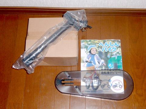 付属品のペダルシステム本体(段ボール箱の中)と、チェーンカバー、空気入れ、そしてパンフレット。