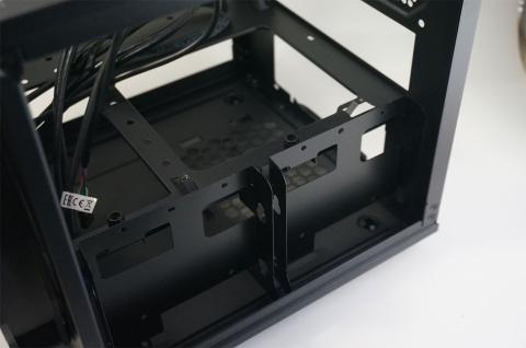 写真手前側が3.5インチ(2.5インチも可)のスペースでその裏側に2.5インチが張り付くようになっている。3.5インチの場合は防振ゴム経由になる。風はあまり当たらない場所なので高発熱のHDDは気になるがITXならまず困る事のない搭載量だ。