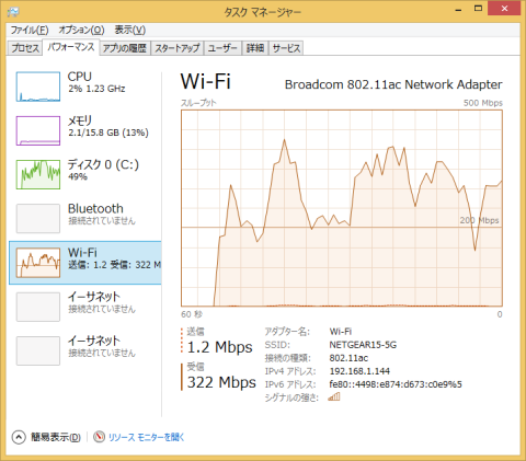 勿論、有線の方が速度は出ますけど、PCを設置する部屋に有線LANの環境が無い場合、べつに無理して配線しなくても WiFi でストレスを感じないんじゃないかと思うレベルです。