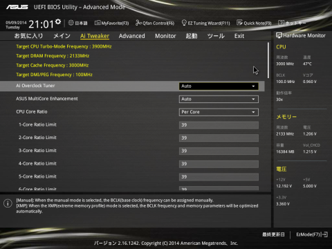 ちなみに、5-Way Optimization で行った設定は BIOS にも反映されるので、AI Suite 3 を立ち上げてないと有効にならないとか、そういうことは無いようです。