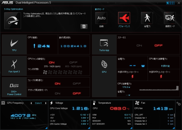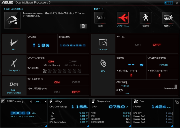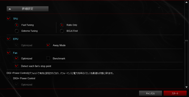 まず、5-Way Optimization ですが、これは「TPU、EPU、DIGI+ Power Control、FanXpert3、Turbo Appの5つの調整機能を兼ね備えたパフォーマンス調整ソリューション」との事で、まぁ、ここで各機能の説明をしても仕方がないのですが、CPU,GPUの設定や省電力、ファンコントロールなどの設定をバランスを取りながら自動で調節してくれる機能のようです。