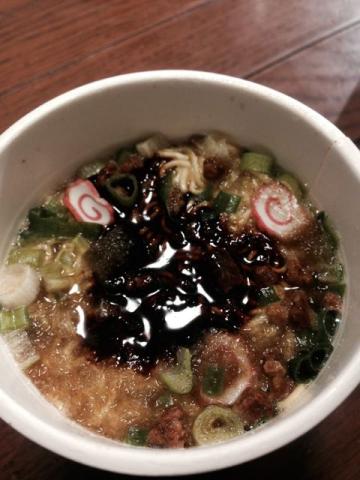味はエースコック的で、可もなく不可もなく。大阪のいいものを集めた感じですね。大阪地元産のネギとか使っているとのことですが、フリーズドライの細切れネギではよくわかりませんよ。いっそでかいカットで入れればいいのにとかね。出汁感も思ってた以上に感じない。もしかすると塩分係数高すぎて味がぼやけているのかも。
