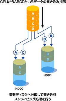 複数のディスクにわたって分散してデータを記録します。