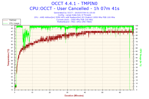 排気性能の悪いケースで、しかもHDDケージの真下配置という不利な条件での動作で、OCCT一時間連続稼働しても、50℃近辺で持ちこたえるこの安定性は、十分合格点と言えなくはないのだが、元々発熱が低めのAthlon5350なら、純正クーラーでもこの程度は確保出来そう。