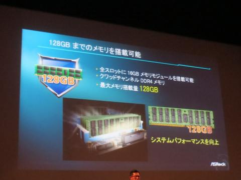 1本のメモリが刺せて、1本16GB×8本= 128 GB(最大メモリ搭載量)となるようです。もちろんECCメモリ対応(エラーチェックして正常な値にしてくれるメモリ)。