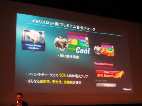 プレミアム合金チョークというのは良くわからないですが、同イベントでメモリのオーバークロックも行っていたので、メモリまわりの性能も良いような印象です。