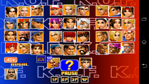 本作は基本バーチャルパッドでプレイすることになり、初心者向けに必殺技をレバー操作+1ボタンで出せるSPボタン(超必殺技はライフゲージを押すだけで発動可能。ちなみにADVモードのPower MAX発動は自分のキャラアイコンを押すだけでOKです)などある程度配慮はされているものの、同社がリリースいるKOFXIIIのサブセット版であるKOF-iシリーズと比べるとどうも操作に難があるような感じがします。幸い本作はBluetooth接続のゲームパッドもサポートしているので用意できるのであればゲームパッドでプレイしたほうがよりアーケードに近い感覚でプレイできるかもしれません。特にNexus 7だとバーチャルパッドのプレイは厳しい感はあったので…