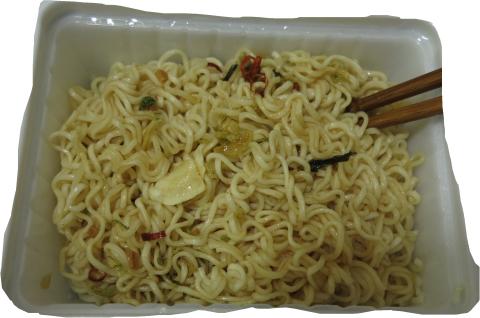が、具材は大きなガーリックチップと輪切り唐辛子がインパクトあり、パッケージ
