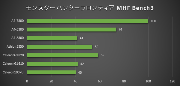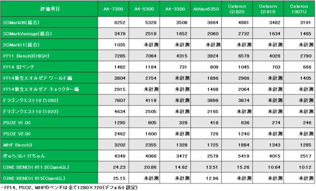 注意:各グラフはA4-7300を100%とした相対性能で百分率で表しています。(単位:%)ベンチマークのスコア自体は表に記載しています。