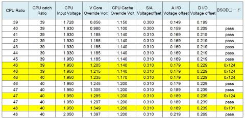 - 定格の電圧を固定したまま、CPU Ratioを上げていって青画面になってしまうラインを見る