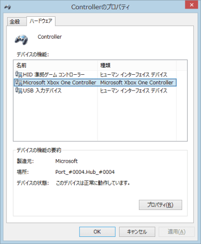 プロパティを見ると、ちゃんと「Microsoft Xbox One Controller」です。