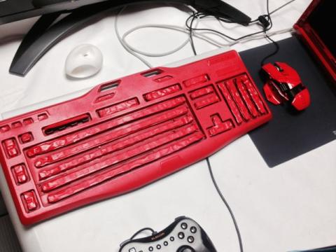 下地がほとんど赤になっているので、修正程度の1層です。磨いてみてわかったのですが、やっぱりキーボードはクリア要らないですね。テカってしまって、写真撮りとかでも困りそうです。