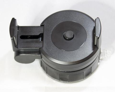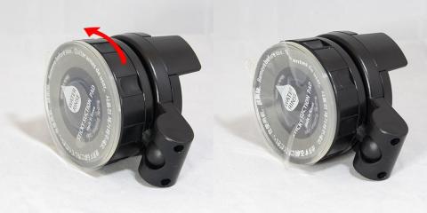 吸盤をロックするには、本体を置いたのち周りのダイヤルを矢印の方向に 90度回すことで貼りつきます。