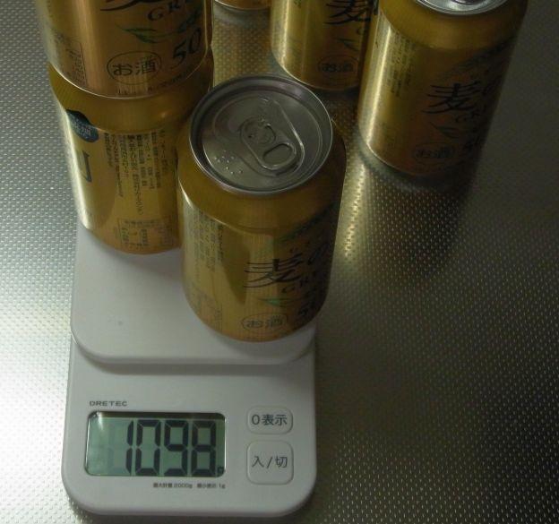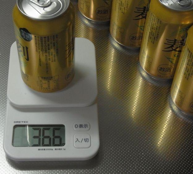 つか、今回測ってみてビール缶って同じ銘柄でも個体によって結構重さが違うのが判明。上記のテストでは一番多かった366gのを選んで実験しましたが、12缶測った中で最低が364g、最大が369gでこれは再現性がありましたから。