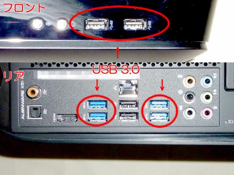 X51はフロントにUSB3.0ポート2口、リアにUSB3.0ポート4口およびUSB2.0ポート2口、という構成になっています。