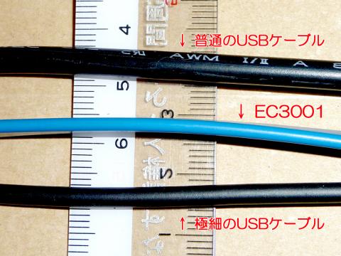 フラットケーブルなので厚み的には極細のUSBケーブルよりも薄いです。