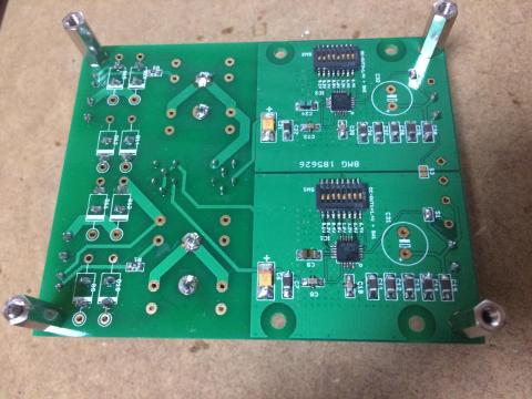 この基板、藤原さんの同様の基板よりも少し凝った作りになっていてEMIフィルターを搭載できたり、正負電源にも正電源×2でも使えます。