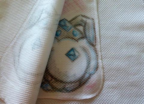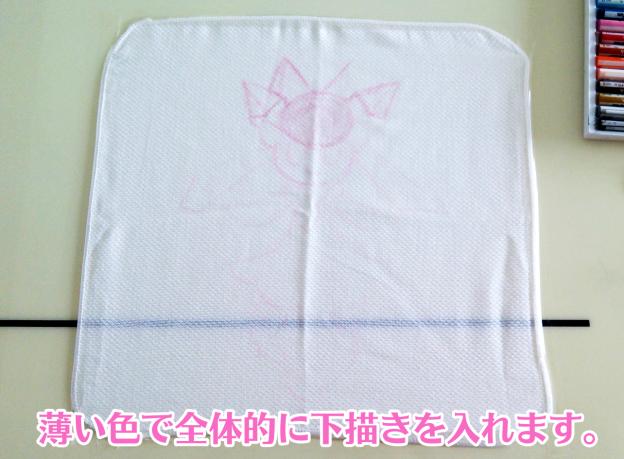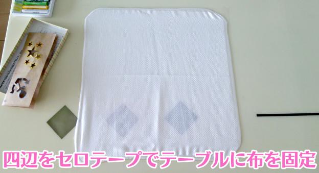 描いている時に布が寄れてしまうのを避けるために、四隅をしっかりと張った状態で固定します。私は非常に大雑把な性格なので、セロテープで直接ダイニングテーブルに固定してしまいました。(テーブルからはみ出したとしても水ふきで消すことが可能ですので)