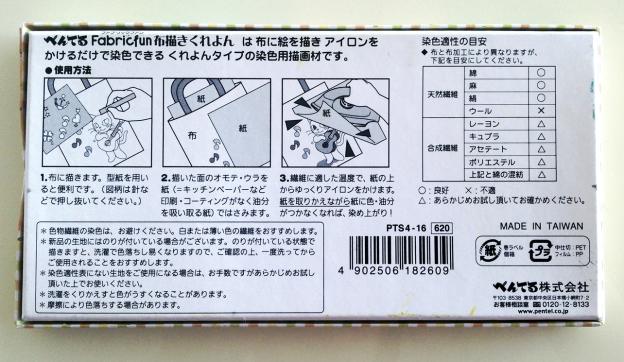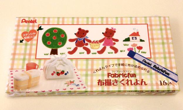 ぺんてるからでている布に描けるクレヨンです。固形染料材なので、布に描いたあとにアイロンをかけて布地を染めた後は洗濯も可能です(まだ洗濯はしていないので、選択後はそのうち追記します)