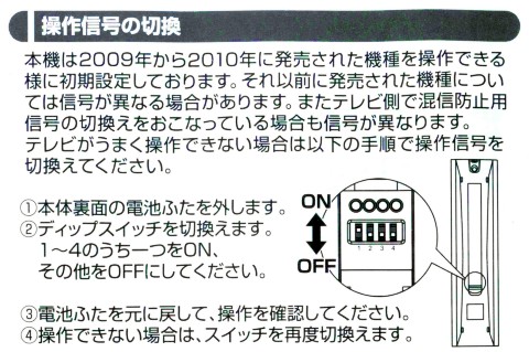 本品は 2009 ~ 2010年に発売された機種を操作できるように設定されており、それ以前に発売されたテレビで動作しなかった場合にこのディップスイッチを変更します。