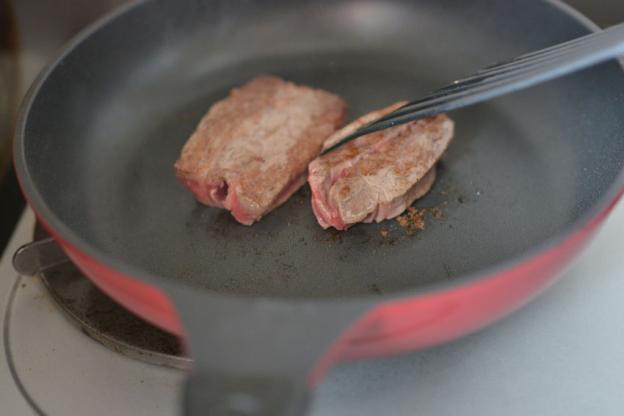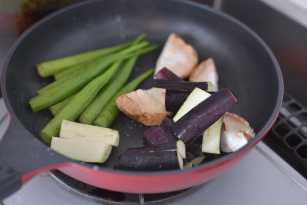 ヒレ肉をお皿に移して、付け合わせの、椎茸・茄・オクラをさっと炒めます。