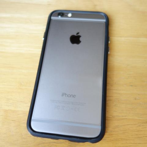 iPhone6の特徴として、カメラが背面パネルよりも飛び出しているが、僅かだがバンパーの厚みの方が厚く、カメラ側を下にして置いても、テーブル面が平らであればカメラが当たることは無さそうだ。