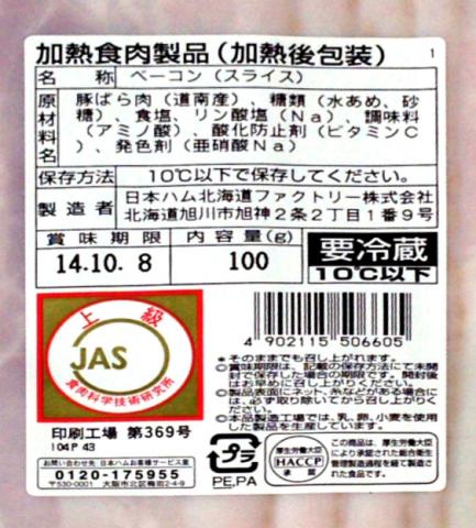 「日本ハム」の「八雲ユーラップ」と言うブランドのベーコン(スライス)です。写真では本当の色が出ません。もしかすると、「肉を美味しく見せる魔法」があるのかもしれませんが、これは美味しい筈です。見立てを外した事はありません。これ、価格も高いけど、味も一流です。