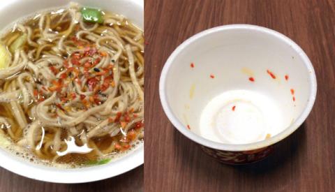 (お湯を注いだら、液体つゆを蓋の上に置いて温めます。食べる前に一味をたっぷり…)