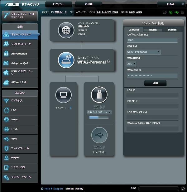 RT-AC87Uは、ASUSWRTダッシュボード管理画面から設定します。グラフィカルでわかりやすい管理画面になっています。私には知らない語句がたくさんあるので検索しながらになりますが(;^ω^)