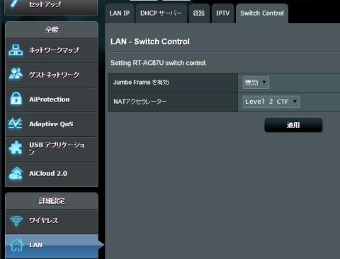 LAN項目のSwitch ControlのJambo Frameを無効にし