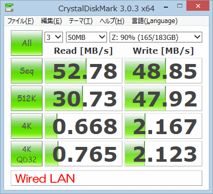 ファイルサーバーの共有フォルダをネットワークドライブで割り当て、読み書きの測定を行っています。