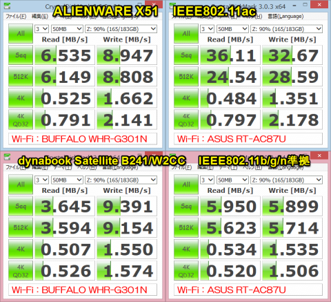 DELLのALIENWARE X51 R2(IEEE802.11ac)および東芝dynabook Satellite(IEEE802.11n)にて性能を測定したいと思います。