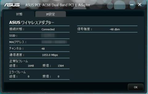 無線のリンク速度も同じASUSのPCE-AC68で1Gbps越えとなっています。