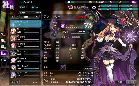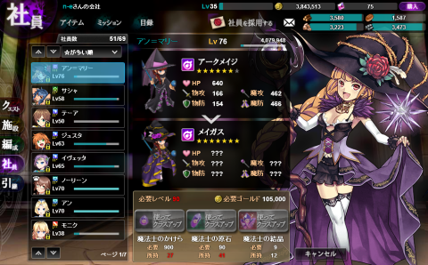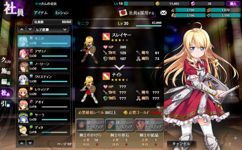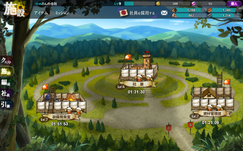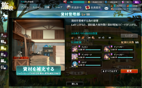 今後増えるようですが、現在施設は3つあります。各施設はレベルアップさせると、社屋は社員数上限が増え、社長スキル(戦闘中に使える支援魔法)を覚え、資材管理部は資源の増加量(1分毎に増える)と最大保持数が増え、装備開発室は通常より性能の高い装備がでやすくなります。