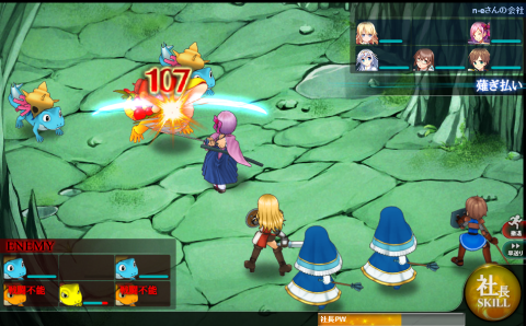 戦闘は社長スキル以外は自動で行われます。クエストによっては配置(前衛3マス、後衛3マスに5キャラを配置する)や作戦(リーダー、ランク、HPが多い、HPが少ない等、優先的に攻撃する対象を選ぶ感じのもの)でクリアしやすくなるので、俺タワーよりは頭を使いそうです。ゲームとしてはいつものブラウザゲームといった感じで、特に面白いところはないです。