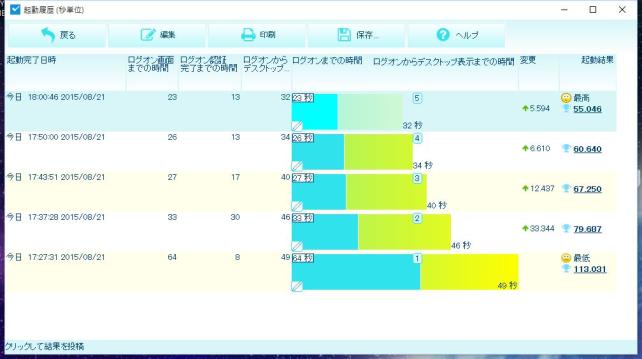 全体の結果(起動~デスクトップ表示)の最高値は55秒、最低値は113秒です。