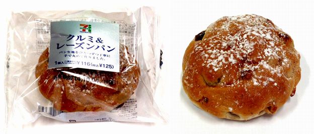 セブンイレブンのクルミ&レーズンパンです。1つ1つ手で丸めて焼かれたパンなので、みんなそれぞれ形が違っています。