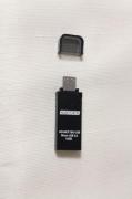 USBメモリー本体の片側がmicroUSB、もう片側がUSBになっていてパソコンにもスマートフォンにも接続できます。microUSB側にはキャップが付いています。