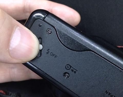 ストラップに付いているパーツ、この突起で凹んだボタンを押します。