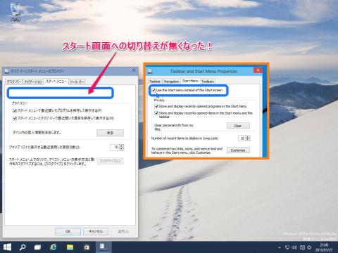 それならスタート画面に切り替えれば、と思ったら、とうとうスタート画面が完全に廃止されてしまったようで、切り替えられなくなっていました。