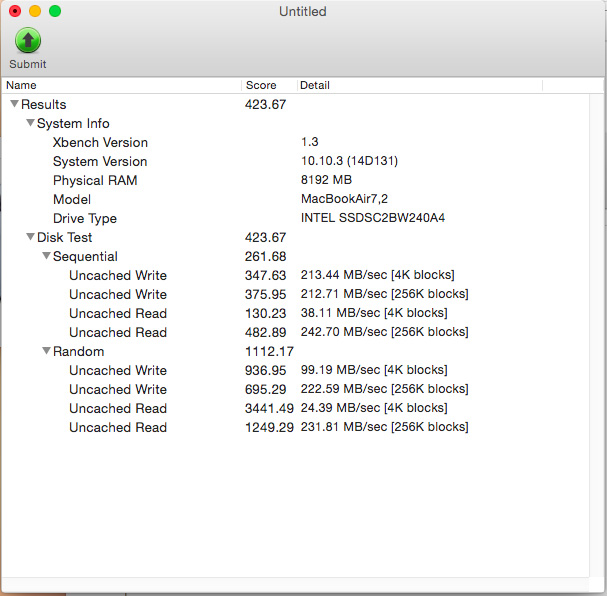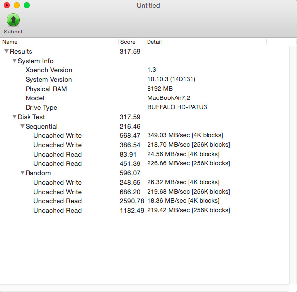 をUSB3.0で接続してXbenchで測定しました。