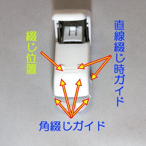 綴じ方は用紙の角を斜めに綴じる方法と用紙の辺に対して平行に綴じる方法があり、この用紙挿入口にガイドが付いています。