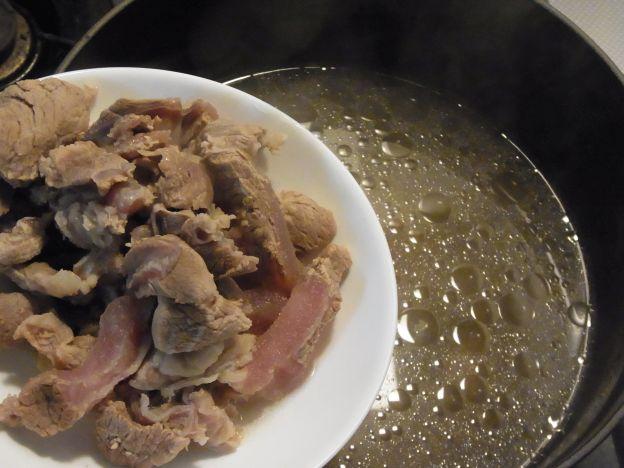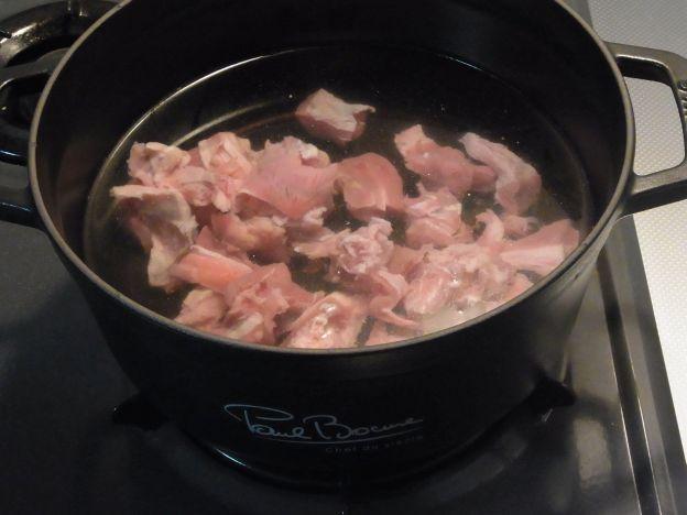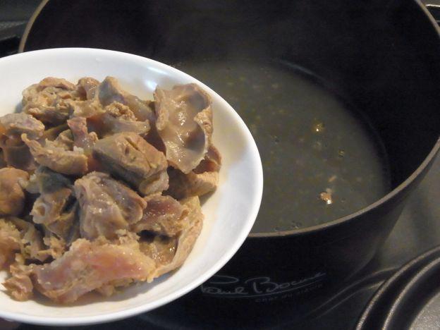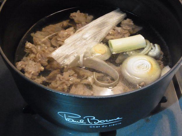 6)スジ肉引き上げる。今度の汁は飲めるので、別にとって塩胡椒してスープに。