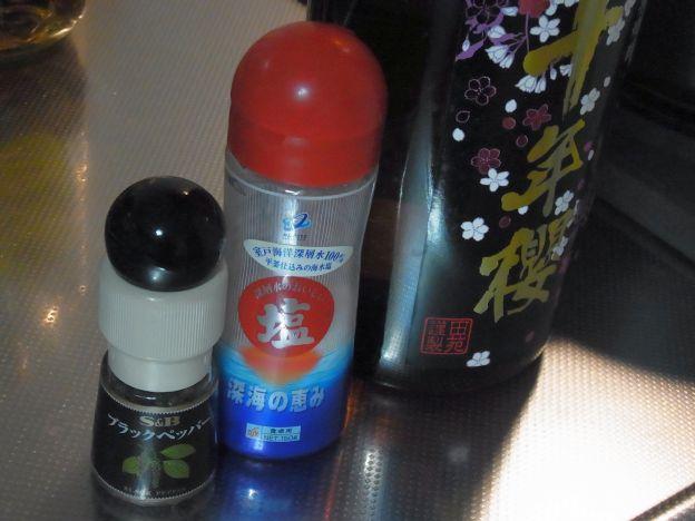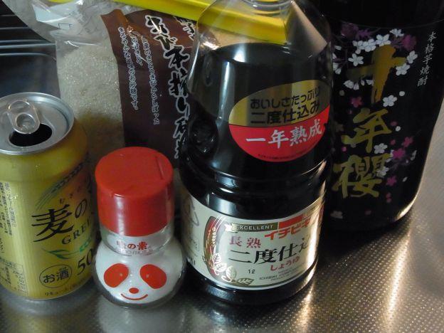 6)今回用いた調味料。酒は日本酒がなかったので焼酎をw