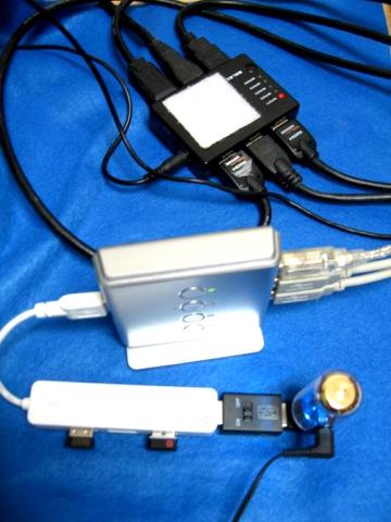 接続して、①ロジクール キーボード/マウスの送受信機 ②ヘッドホンのBT送信機 ③USB D/Aコンバーター 音声モニター ④USB ON/OFFスイッチ(地デジチューナーでUSB音声アダプターが