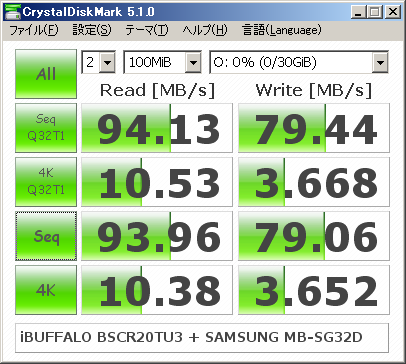 またシーケンシャルリード時も公称値の90MB/sを明らかに上回ってきました。これまでは90MB/sに僅かに届かないというところでとどまっていましたので、公称値をはっきり超えてくれたのは嬉しいところです。もっとも、シーケンシャルライトの公称値は80MB/sですので、まだ僅かに届いていない訳ですが…。