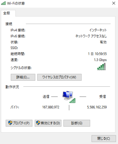 通信速度が1300Mbpsでてます。うれしい。前の無線LANも機器の最高速度がでていたので2Fでもいい位置なのかもしれません。ちなみにうちは鉄骨住宅なのでこの値は優秀かなと思います。