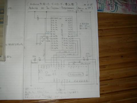 上の写真、ちょっと間違ってます。Digital 10ピンは書き込まれるAVRの*RSTに接続して10kΩで5Vにプルアップしてください。