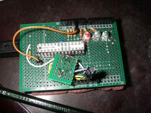 Arduinoバニラシールド基板のDigital 11ピンの位置とICソケットの17番ピンを出来るだけ最短距離で配線できるようにICソケットを配置するとジャンパの配線が真っ直ぐになって爽快感倍増です。